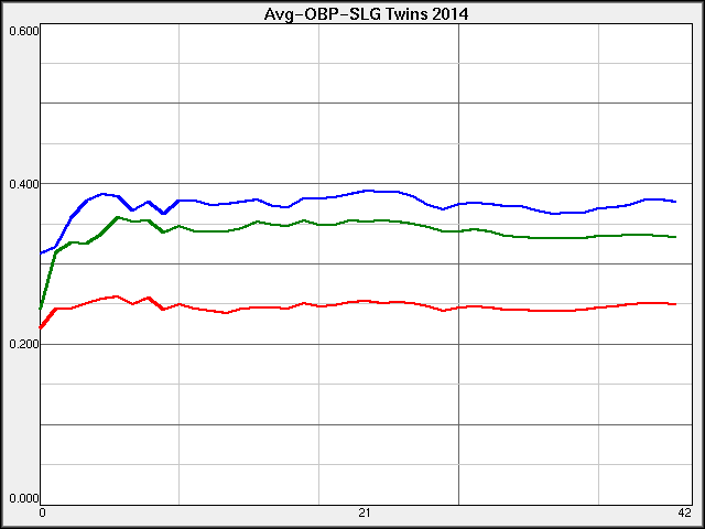 Team batting average (AVG), on-base percentage (OBP) and slugging percentage (SLG) for the MN Twins.