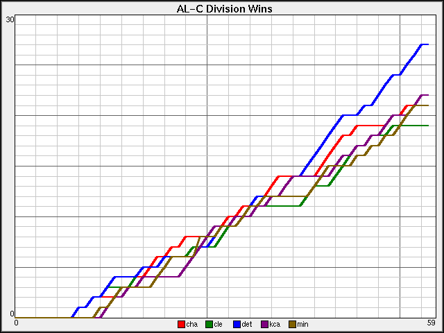 Number of games back (so far) for teams in AL-C. The winning team is flat-lined at the top and the other teams are below accordingly.