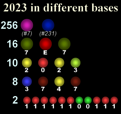 Secondly, most importantly, any number that can be expressed with 0-9 (base ten) can be expressed with 0-1 (base two). Or with 0-7 (base eight) or 0-15 (base sixteen) or whatever number base we prefer. Any number that can be expressed in one base can be expressed in any other base.