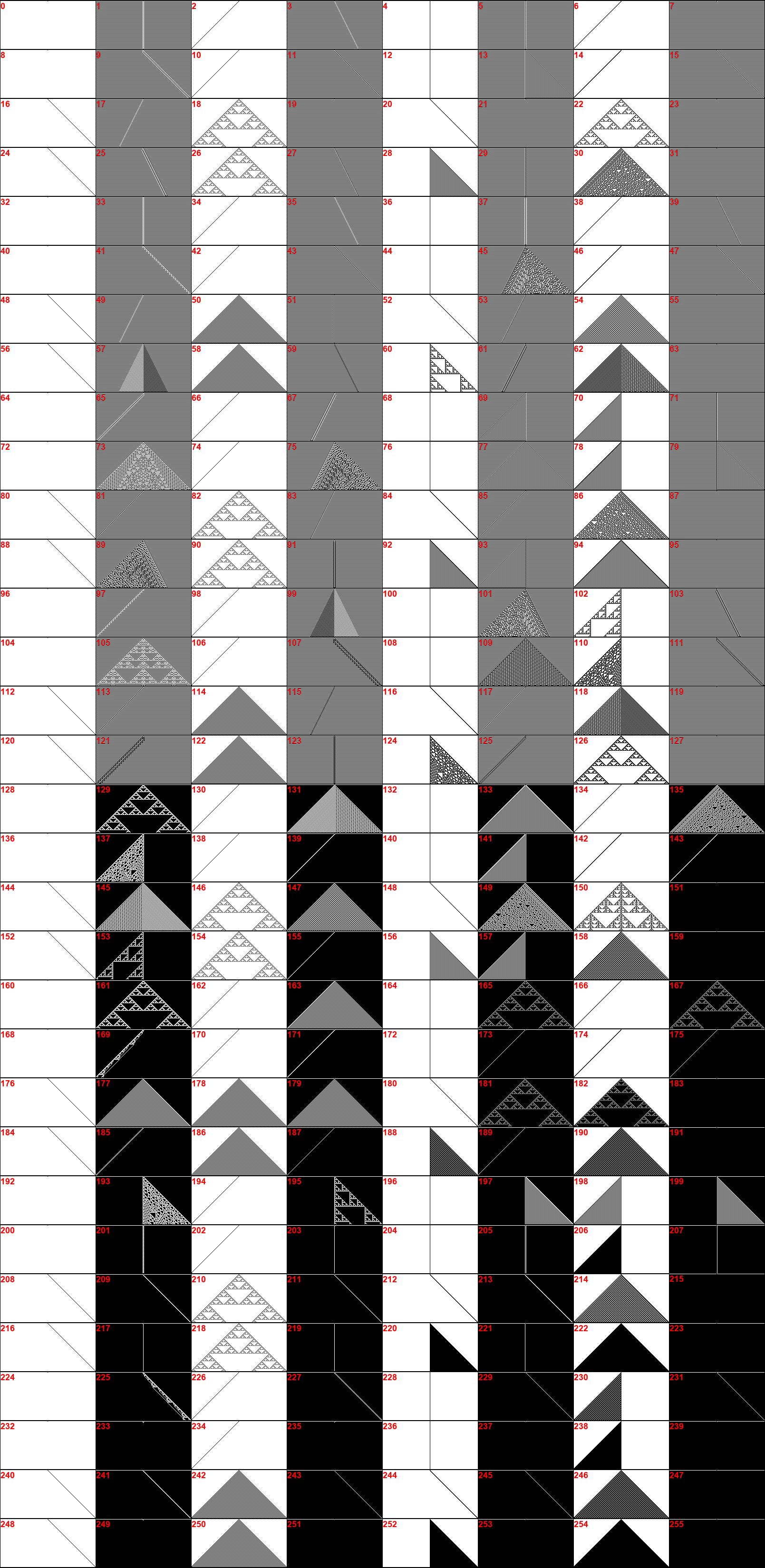 The catalog (click for big) shows all 256 rules, and the eight-column format highlights the commonality of rules. For instance, odd-numbered rules have darker backgrounds, largely because the output of a “000” triplet is a 1.