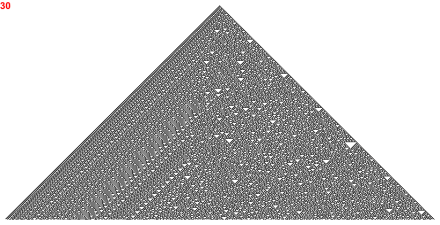This is the same code from last time, so see the previous post for a detailed explanation. The short version is that the generate_rule function converts the integer to a list of the binary bits comprising the integer and builds a dictionary with three-bit keys indexing each bit.