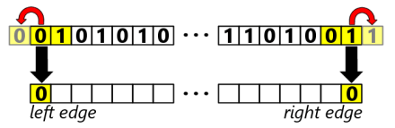The faded cells in the above represent a “virtual” cell (that isn’t really there) on each end of the row. We duplicate the triplet center cell — whatever it is — as that virtual cell. Lines #29 to #31 handle the left-hand case, and lines #32 to #34 handle the right-hand case.