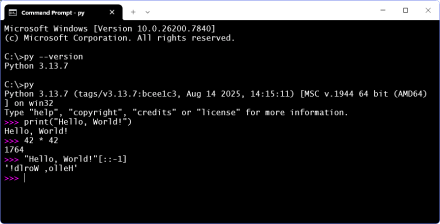 Next, type just py and press [Enter]. This puts you into the Python REPL environment (“read-evaluate-print-loop”). Now you are interacting with Python: