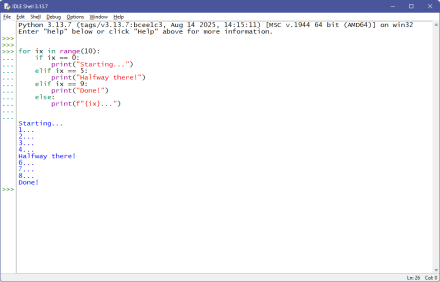 Interacting with a Python prompt is useful for exploring and trying things but not much else. The IDLE prompt is smart enough to auto-indent, so it’s possible to write simple constructs:
