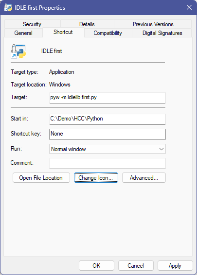 There are two wrinkles here. Firstly, rather than py, with IDLE we use pyw (Python “windowless”) because we don’t want a command window, just the IDLE window. Secondly, be sure to change the Start in: directory to where your Python script is.