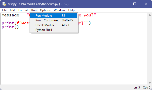Once we give the file a name and save it (let’s call it “first” — IDLE will save it as first.py), we can run it: